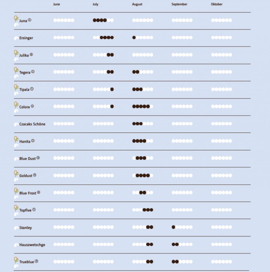 Lista celor mai populare soiuri de prun din Germania din gama Artevos, clasificate după perioada de maturare.
