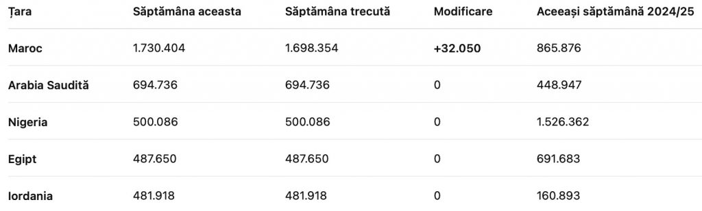 Principalele destinații ale exporturilor de grâu moale ale UE în 2025/26 până în prezent au fost următoarele (tone):