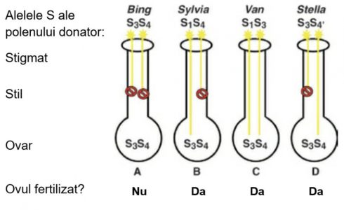 - B) Polenul soiului Sylvia care conține alela S4 nu poate fertiliza soiul Bing, însă polenul cu alela S1 este compatibil și poate asigura legarea fructelor.