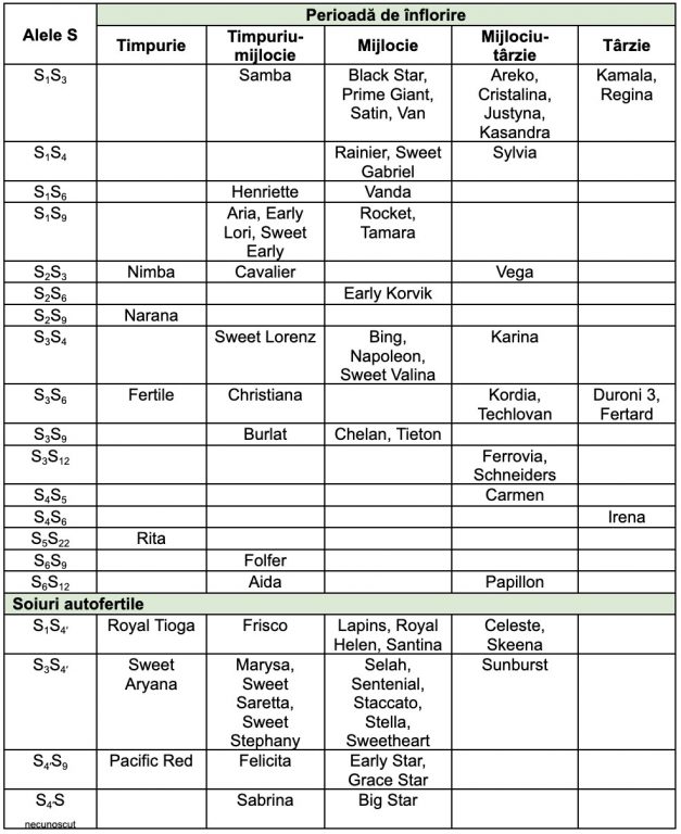 Tabelul de mai jos prezintă genotipurile S și perioadele de înflorire pentru câteva dintre soiurile populare de cireș. Surse: www.artevos.de, Long, L.E. Sweet Cherries (Crop Production Science in Horticulture), 2021; CABI