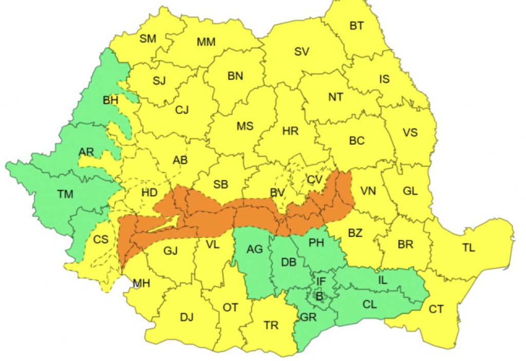 ANM a emis cod portocaliu, valabil duminică și luni dimineața, până la ora 10, pentru zona înaltă a Carpaților Meridionali și de Curbură.