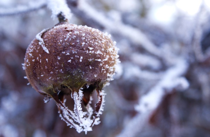 În condiții blânde de iarnă, fructele pot rămâne pe ramuri până primăvara.