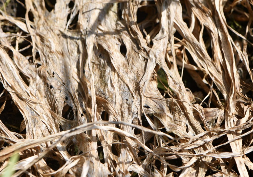 În opinia mea, întrețeserea de hife și frunze uscate arată ca o țesătură compactă sau nu, funcție de densitatea miceliului, care are culoare albicioasă la început, apoi rozalie sau portocalie (sporodochii prezente).