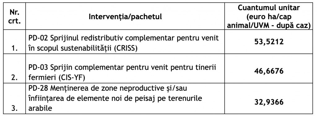 Cuantumurile unitare ale plăților directe pentru aceste intervenții sunt stabilite prin Ordinul MADR nr. 42/17.02.2026 pentru aprobarea cuantumului unitar al plăților directe aferente cererilor de plată depuse în anul 2025, finanțate din Fondul european de garantare agricolă prin intervențiile din cadrul Planului strategic PAC 2023-2027, publicat în Monitorul Oficial al României, Partea I, nr. 128/2026.